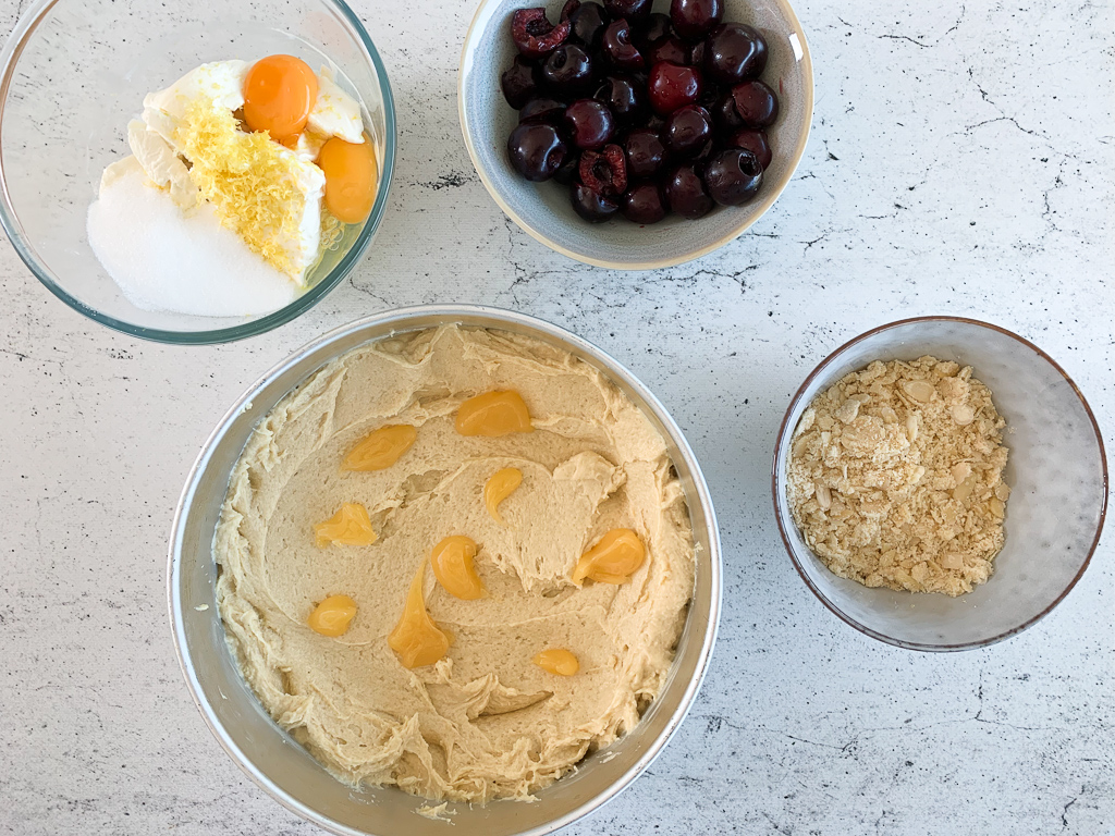 - Pitt the cherries with cherry pitter or just use your fingers to tear them apart and then remove the stone. Add the pitted cherries and then add the rest of the lemon curd. Combine the almond slivers with the reserved crumble and then sprinkle on the cake.