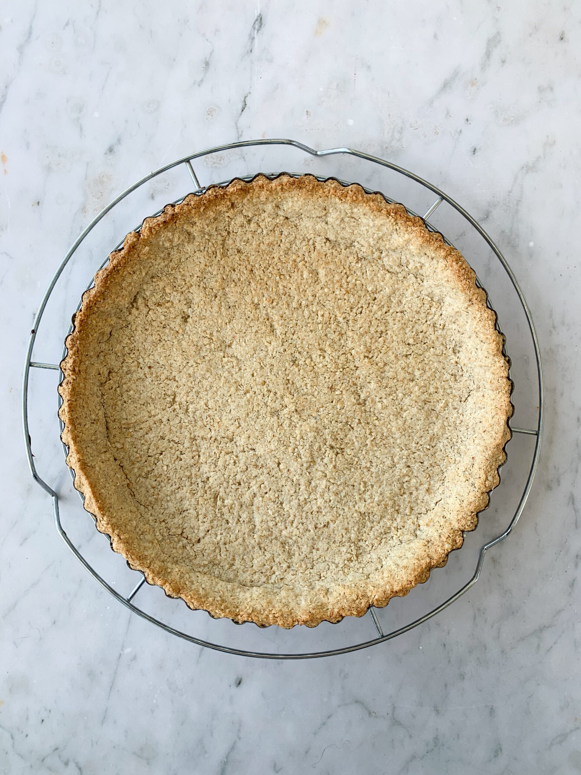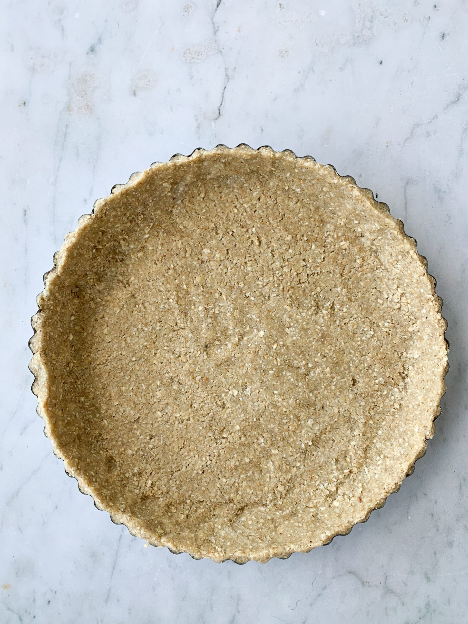 - Preheat the oven 175C/Fan. Place 175g of the oats in a food processor and pulse until you have a course meal. Now add the remaining oats, ground almond, sugar and butter. Pulse until the butter is incorporated and you have small and large lumps of mixture. Add the water and pulse until the pastry dough just comes together. Tip the whole lot into a bowl. Grease the pastry case with butter. This pastry doesn’t require rolling, you just have to press it into place, smoothing the surface with the back of a spoon.