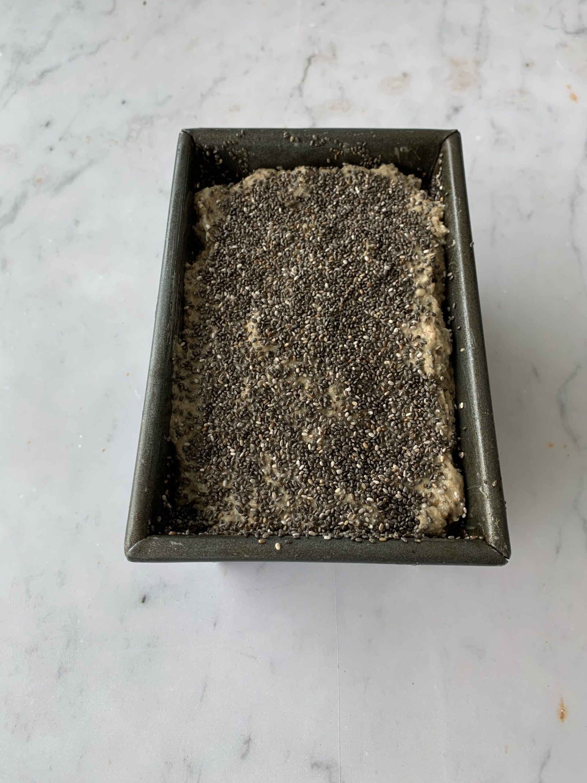 - Pour the wet dough in the tin and sprinkle the surface of the loaf with more chia seeds.