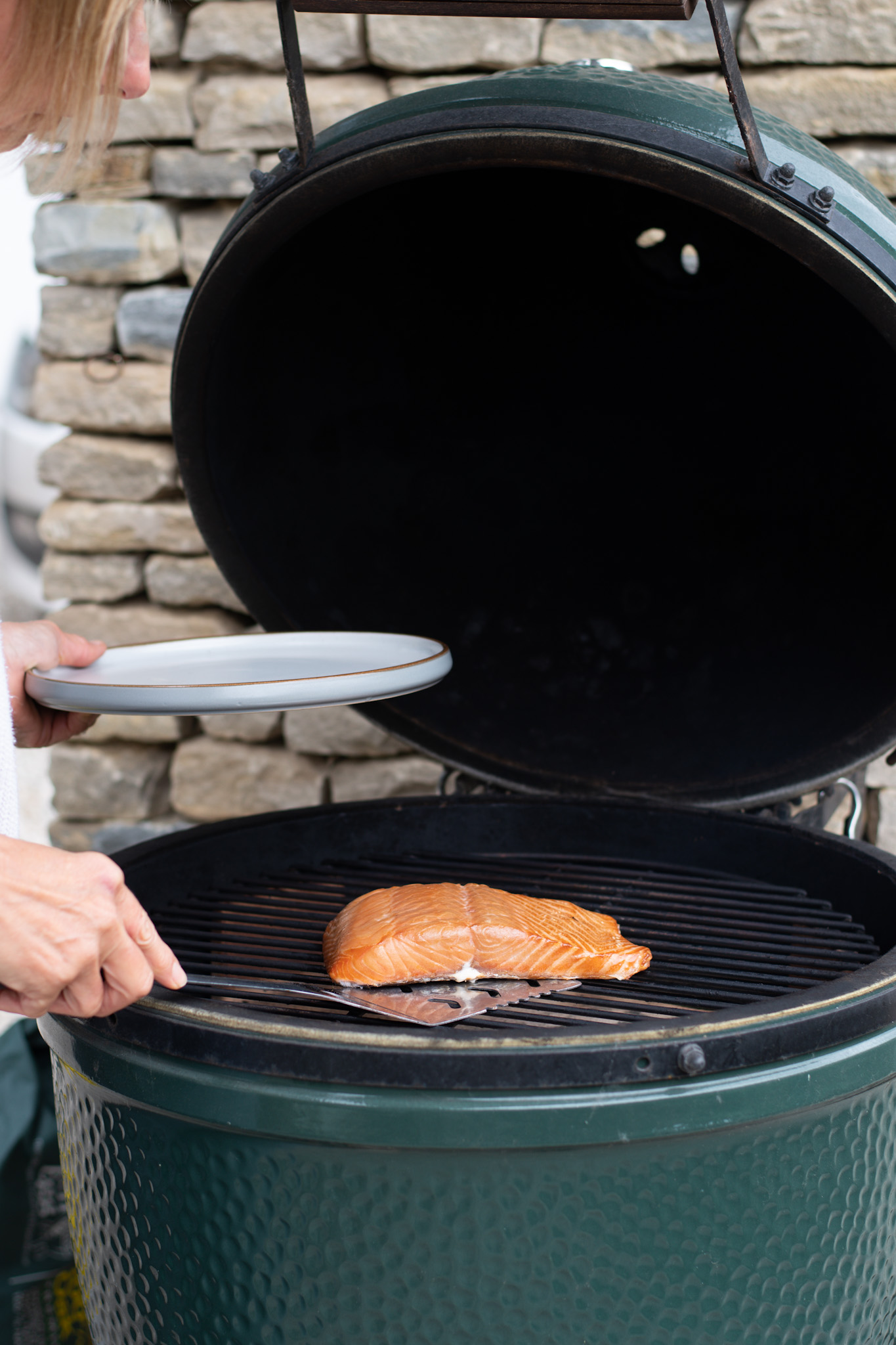 - My Egg is set to 130C. Sprinkle the applewood chips on the coals. Shut the lid for a minute or two. Now open and place the fish fillet on the griddle and shut the lid. Check the salmon after 25-30 minutes, cooking times will vary according to the thickens of the fish fillet. If you have a meat thermometer insert it into the thickest part of the fish. It should reach 70C. Continue to cook until it's done. Remove and serve warm or cold