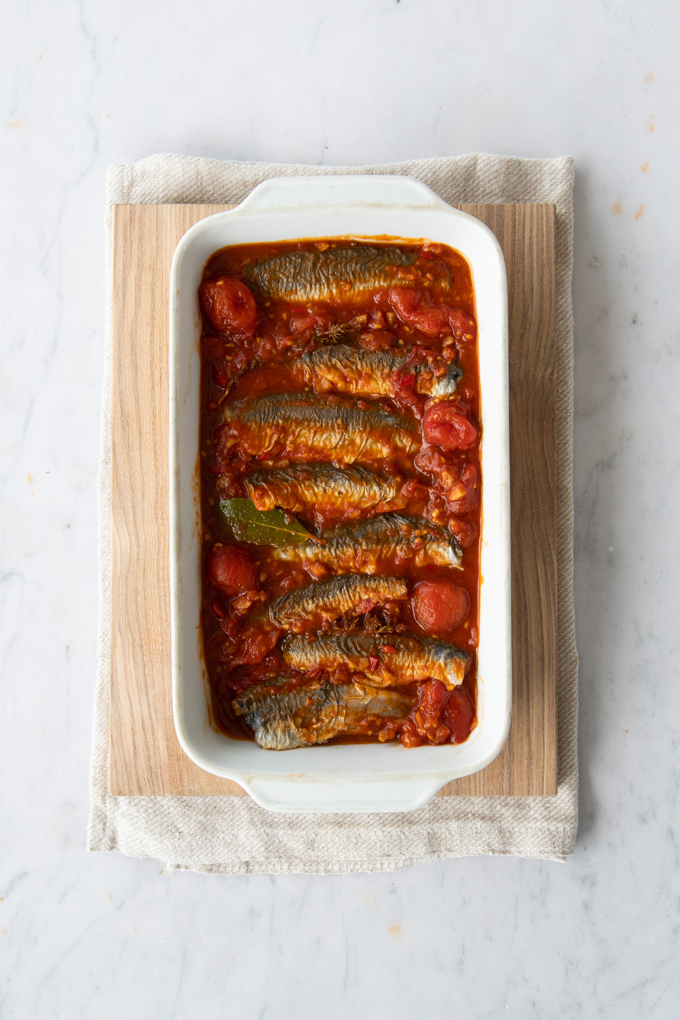 - In a suitable dish pour half of the tomato sauce, then arrange the sardines on top. Pour the remaining tomato sauce on the. Marinate in the fridge for 24-36 hours.