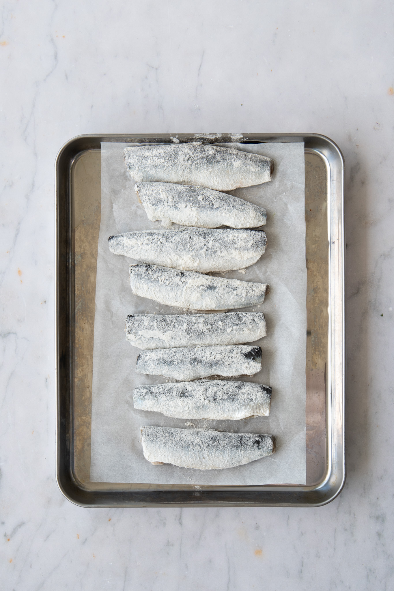 - Begin by sprinkling the flour on to a dinner plate, then season with salt and pepper. generously coat the sardines in flour, shake off excess and place on a clean plate. Heat the sunflower oil in a shallow pan until it shimmers. Fry the sardines in batches until just cooked through, approximately 2-3 minutes, depending on their size. Set to one side.